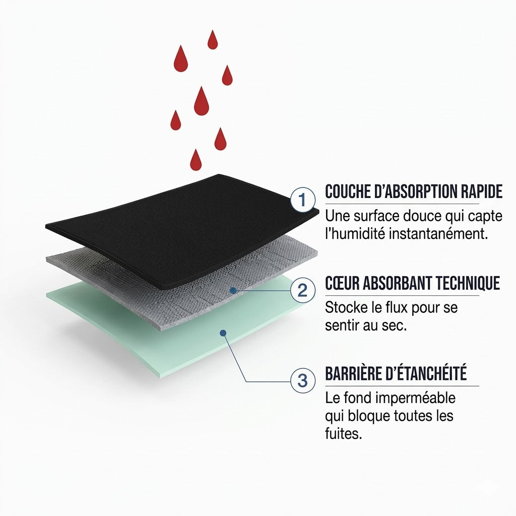 Les maillots Nympha-E intègrent une technologie à trois couches : une première pour l'humidité, une deuxième pour absorber le flux, et une troisième pour l'étanchéité.